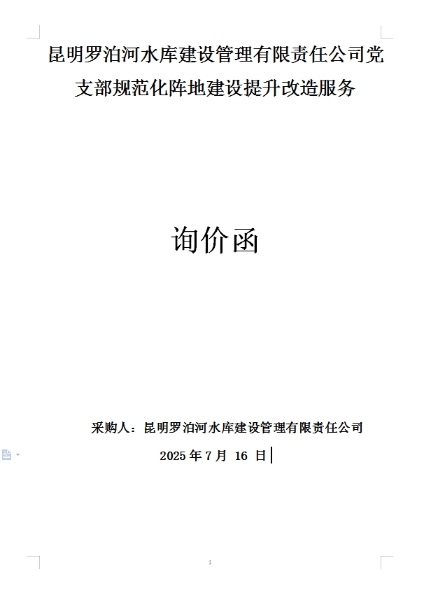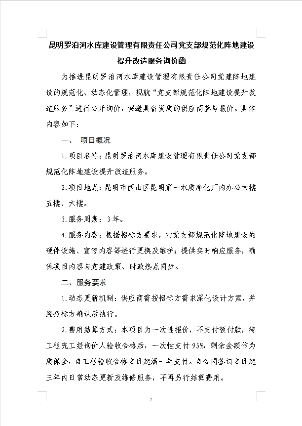 昆明羅泊河水庫建設(shè)管理有限責(zé)任公司黨支部規(guī)范化陣地建設(shè)提升改造服務(wù)詢價(jià)函