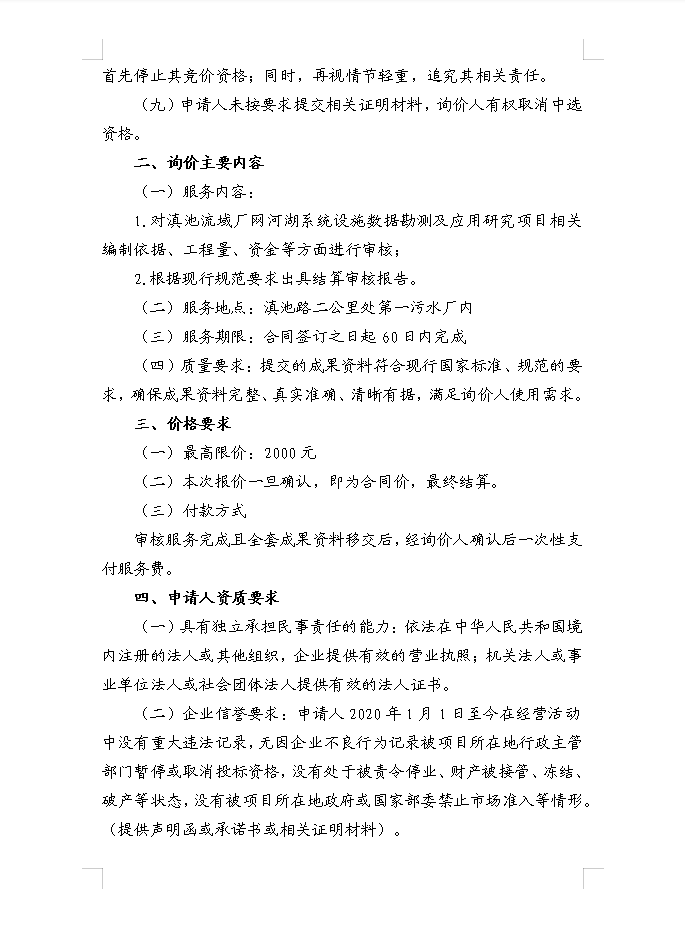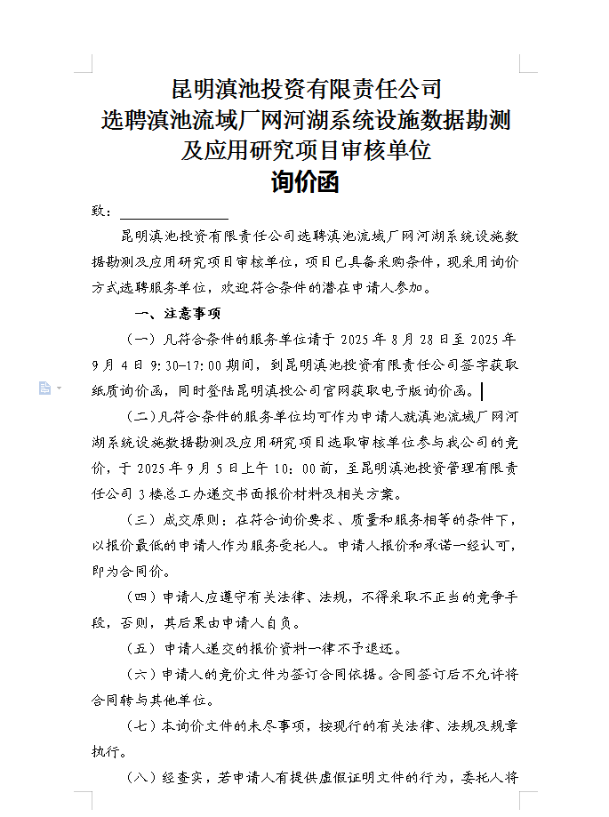 昆明滇池投資有限責(zé)任公司選聘滇池流域廠網(wǎng)河湖系統(tǒng)設(shè)施數(shù)據(jù)勘測及應(yīng)用研究項目審核單位詢價函